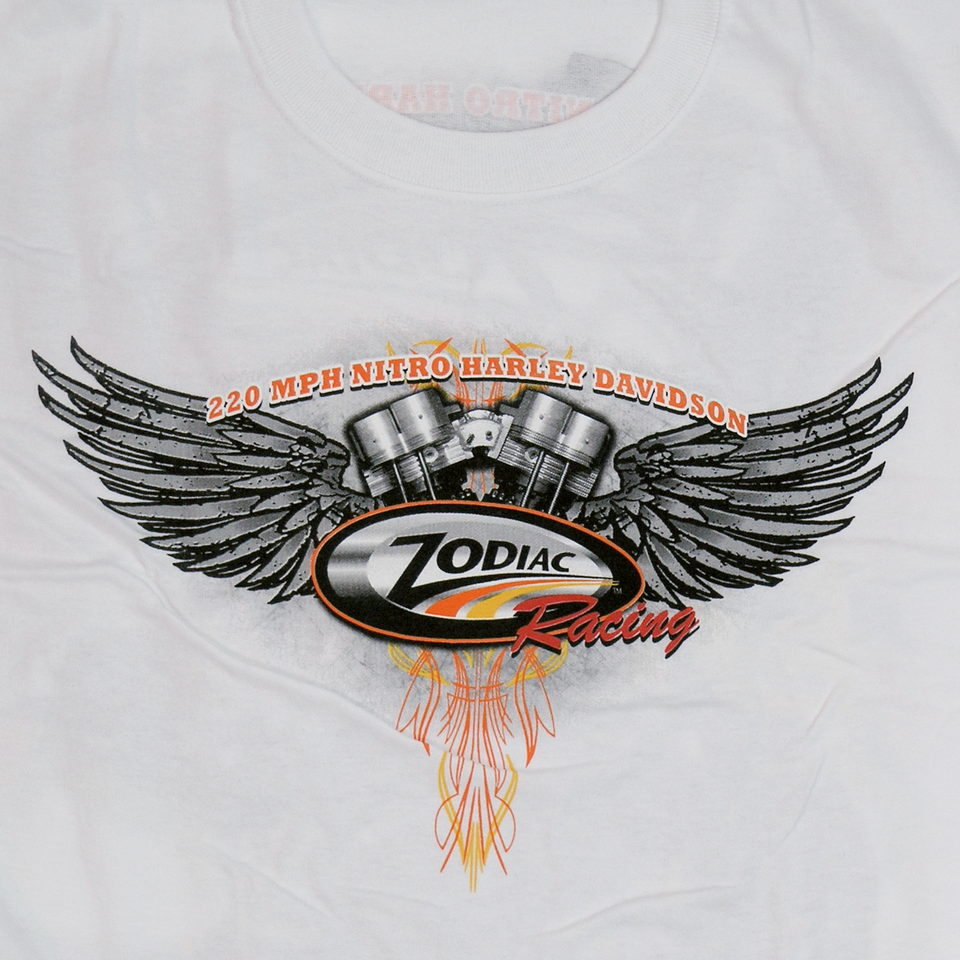 High quality T-shirt of the multiple European championships winning Zodiac Racing drag bike, build and maintained by Crew Chief Vincent Pels and technical mastermind and Zodiac’s founding father Ton Pels. These T-shirts show Ronny Aasen taking off with the Godfather VII Nitro Harley-Davidson drag racer for another 220 MPH (355 km/h) 6 second pass. Printed on front and back, US sizes!