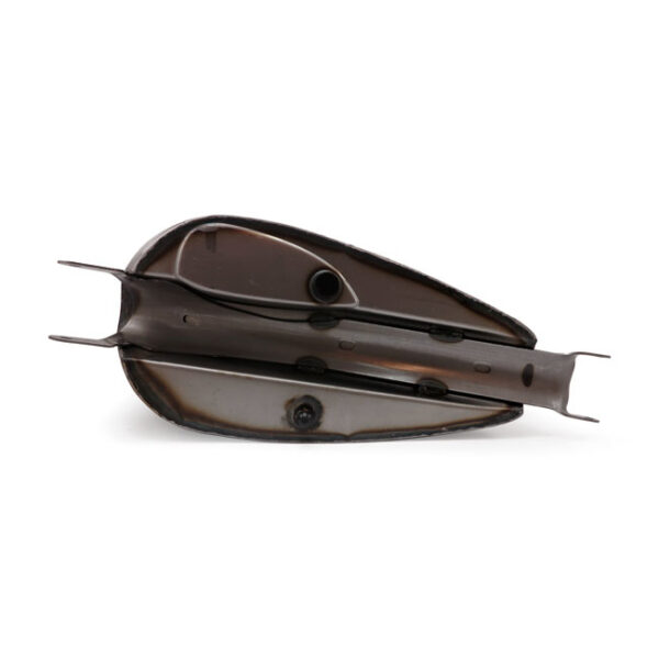 Raw steel. This is the original Sportster Iron Guerilla fuel tank that won Winston his first bike building Word Championship. A slim design that resembles a classic Sportster tank but that transformed with Winston’s artistic creativity to something way more. This tank will complement a bone stock Sportster but will also shine as the centerpiece on a wild custom, not many can do that. Used with a regular 22mm threaded 74-up style petcock for carbureted bikes and OEM & OEM style screw-in gas caps. Dimensions approx.: 22.8cm overall width x 49.2cm overall length tank body (excl. the brackets). Capacity approx. 9 liter (2.4 gallon).