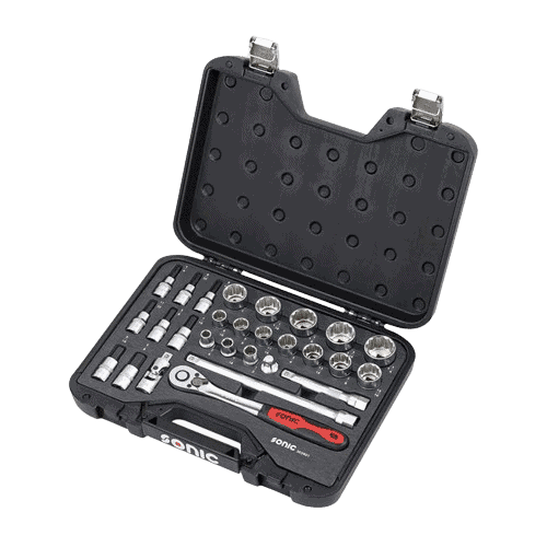 28-piece set. 1/2″ drive. Includes ratchet, accessories, sockets, deep sockets and bit sockets. Kit includes: – 8x Hex bit sockets: 1/4″ to 5/8″ – 15x 12-point socket: 3/8″ to 1-1/4″ – 1x Swivel joint – 1x Adapter: 1/2″ (male) to 3/8″ (female) – 2x extension: 125, 250mm – 1x ratchet: 262mm long – Packed in a Blow Mold Storage Case