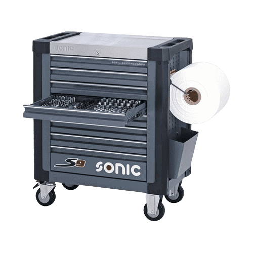 S9 toolbox 8 drawers, 7 of which are filled with 349-piece tool set. – Filled toolbox for professional motorcycle mechanics – Comprehensive tool set for both Japanese and European motorcycles – Full socket set 1/4″, 3/8″ and 1/2″, including 3 torque wrenches – T-wrench with rotating handle, for fast and efficient work – Set is equipped with ring ratchet wrenches – Drawer 8 is free for tools of your choice