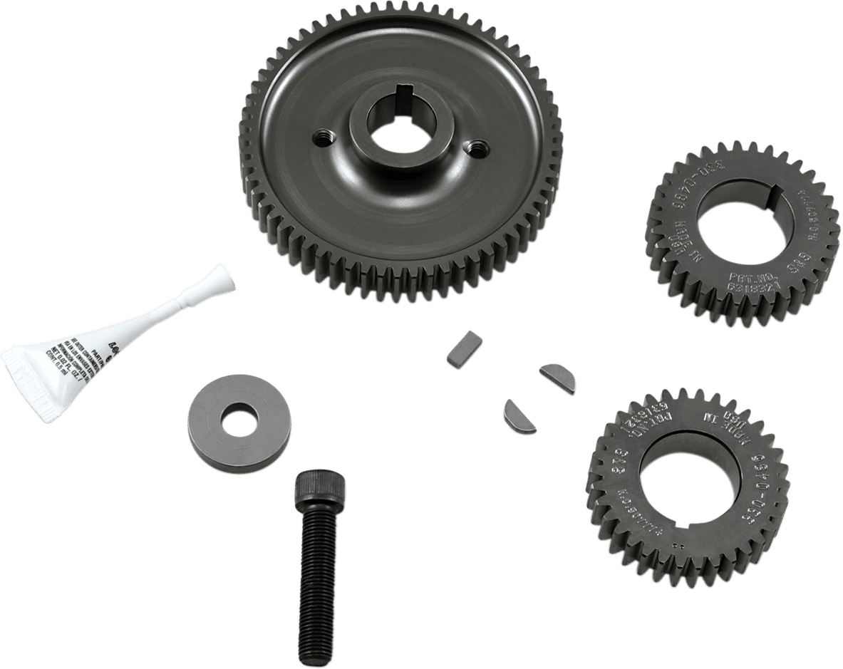 • A four-gear set is required for gear-driven cams that do not come with secondary cam gears; includes two secondary cam gears, outer cam drive gear, outer pinion drive gear and mounting hardware