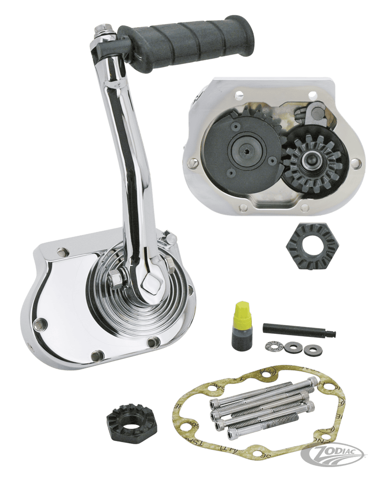 These newly designed kick starter kits feature a beefy starter shaft and come pre-assembled. They are easy to install as they just replace the clutch control cover and bolt straight onto the stock transmission trap door. Starter housings are CNC machined billet aluminum and have a chrome finish. Kits come complete with a heavy duty kick starter arm, chrome return spring, old style rubber kicker pedal, chrome hardware, gasket, clutch release mechanism and chrome dipstick. Available s for our TPD and Eco Line 6-speed transmissions. Also fits many other aftermarket 6-speed transmissions.
