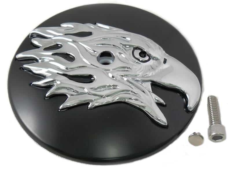 Air cleaner cover insert features a chrome eagle on a round chrome backing plate.