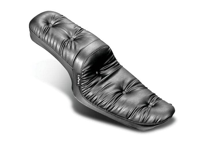 Foam. Regal Plush upholstery. 10″ rider & 9″ passenger seating area width. A lower than stock profile for a deep, comfortable seating area. Plenty of lower back support for all day cruising without the bulk of large Touring seats.
