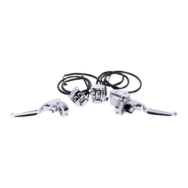 For H-D CAN-bus wired models. Includes left side mechanical clutch lever assembly and right side hydraulic draulic brake master cylinder assembly. Complete with stock style switch housings and right & left side switch modules with black switches. The right side kit includes the front brake switch, the left side includes the clutch switch. Both come with a 48″ long wiring harness for compatibility with al handlebars from standard to extra high or wide bars. Note: Two CAN-bus styles are used on H-D models. A) Pre-2016 models: The turn signal switch is connected directly to the turn signal. B) 2016-present models: The turn signal is directly connected to the BCM (Body Control Module) and the turn signal switch to the ECU (Electronic Control Unit) This handlebar switch & wiring kit fits both A and B models. An additional turn signal wire is installed on both left & right side for compatibility with the early Pre-2016 CAN-bus models. Note: Will not fit models with cruise control. Note: See 920673 for replacement front brake switch only and 920711 for replacement front clutch switch only.