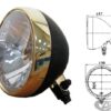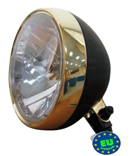 Bottom mount headlight with black housing, bronze bezel and 7″ TÜV/EU approved H4 12V 60/55 W halogen lamp and parking light. The unit has a diamond cut reflector. Housing is 2 7 1/2″ (19cm) in diameter and is 6.18″ (15.7cm) long.