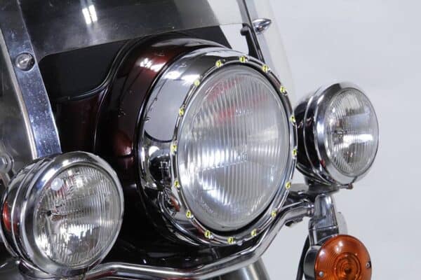 Chrome halo LED headlamp ring for adding style to your headlight for both day or night riding. This ring features sixteen bright white LED lights around the entire ring giving a halo effect around your headlight.