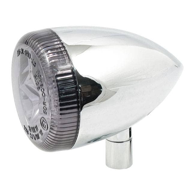 Smoke lens. Chrome. Universal M10x1.25 mm stud. Dual LED equipped. Taillight, brake light & turn signal in one, as introduced on the 2009 Sportster XL883N Nightster. Great in custom applications or as replacement for the 69360-08 H-D HDI LED unit or the 68449-07 unit witch comes with a regular bulb. With E1 approved lens.