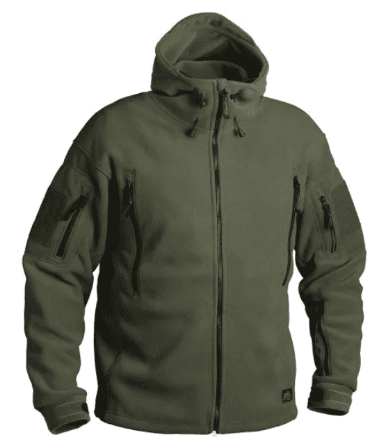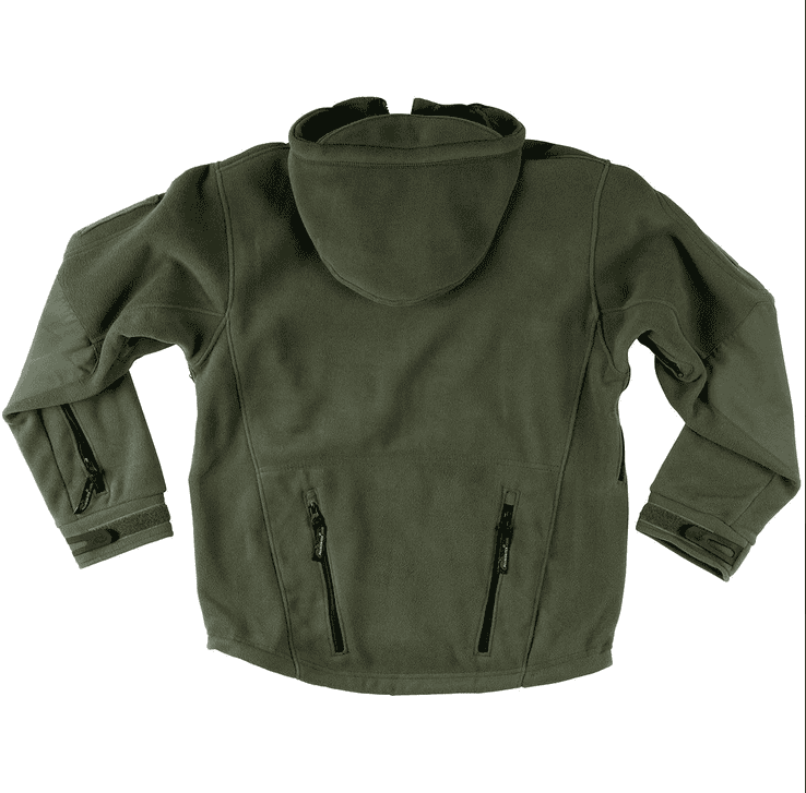 This warm, comfortable and sturdy heavy fleece jacket features quality double superfine fleece, a high collar integrated with a hood and a strong full-front zipper, which can be fastened to the neck, a as well as re-inforced Cordura material on backs of the sleeves. Furthermore it goes with two chest pockets, two upper pockets on each sleeve and one lower pocket on the left sleeve, and a large pocket on the lower back. All pockets with zipper. What is more it has Hook-and-loop plates on each arm, armpit ventilation zippers, adjustable Hook-and-loop wrist cuffs and drawstring waistband with cord lock. Ideal for fishing, hunting and a lot of other outdoor activities no matter the weather.