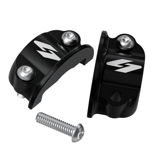 Black anodized aluminum. Used if you plan to run stock 2014-up switch housings with the Kraus FM Fly Moto handlebars. Will also fit 08-13 Touring with early OEM handlebars. Designed and CNC machined billet aluminum to the high Kraus standards to replace the Harley stock half clamps. Keeps a clean look while securing the handlebar master cylinder and clutch control. Note: Small modifications may be needed.