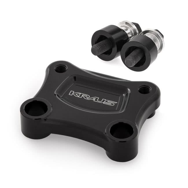 Black anodized aluminum. The T-Rex Pull Back Plate mounts to the top of the triple tree and moves your bar mounts towards the rider 2.5″ (6.35cm) for a more comfortable ride. It solid mounts to the stock or aftermarket triple trees and the risers solid mount to the T-Rex Plate. Since the handlebars have no longer vibration insulating dampers Kraus recommends the use of their Isolated Risers with built-in vibration damping. – Moves bar towards rider 2.5″ (6.35cm) – Adds 1″ (25.4mm) of total height to the bar/riser – It is recommended running Kraus Isolated Risers with this setup for Vibration Damping – Black anodized CNC machined billet aluminum. Note: Total height may vary slightly depending on the bushing and/or bar type.
