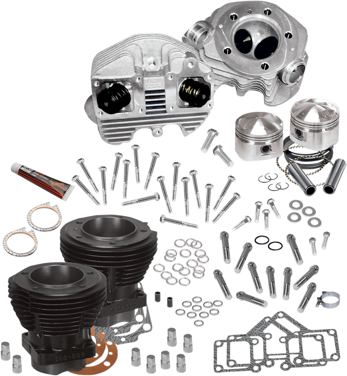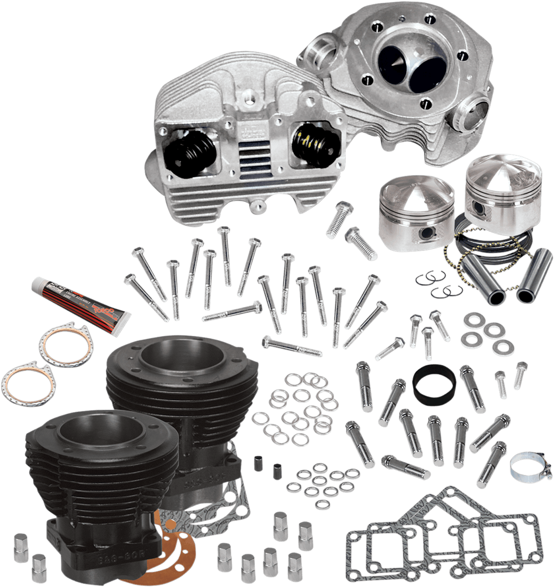 - Include a set of S&S Shovelhead-style cylinder heads, a pair of S&S stock bore cylinders (3-7/16″ for 74″ engines or 3-1/2″ for 80″), forged 8:1 compression pistons complete with rings and wrist pins, manifold clamps, manifold seals, all required hardware, and gaskets