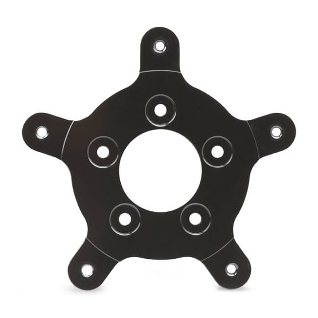 This adapter allows installation of ‘open center’ spoke mount style brake rotors, like used on 14-up Touring, on to regular ‘early style’ 5-bolt H-D hubs that are used in many custom steel or billet wheels. Manufactured from forged aluminum and CNC precision machined. Complete with hub mounting hardware.